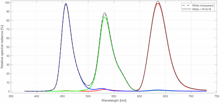 When it comes to color accuracy, one potential problem lies in the interactions between the primary color channels (red, green, blue) when rendering arbitrary colors, including white. Specifically for white, if everything was perfectly accurate, the luminances of the primary colors would add up to LW=LR+LG+LB(=LRGB for short). Ignore, for a moment, that white has its own sub-pixel in this monitor. Deviations from this perfect relationship can be quantified by the (normalized) error Δe=(LRGB−LW) / LRGB (see Figure 2). We can interpret this error also as a saturation error, a de-saturation coefficient, or a cross-talk coefficient. Note that, normally, the according measurements are also sensitive to de-saturation effects caused by the residual background illumination, which becomes overly dominant for dark shades. Besides dark shades being more difficult to measure accurately, this is why dark shades have been excluded from the graphs shown in Figure 2. Obviously, residual background illumination is not an issue with OLED monitors, because they don't have a backlight that could cause residual background illumination. Moreover, because this monitor has a WOLED panel, that is, an extra sub-pixel for white, this test does not measure what it was designed to measure in the first place, namely the interaction effects between the primary color channels when they are mixed to reproduce white. Still, a big Δe would indicate some sort of color accuracy issue, no matter where the big Δe comes from. The effects would be rather subtle though. For example, unlike with non-WOLED monitors, a big Δe would not mean that all colors appear washed out; it would rather mean that there are some color space distortions somewhere "deeper inside" the color gamut (loosely speaking).